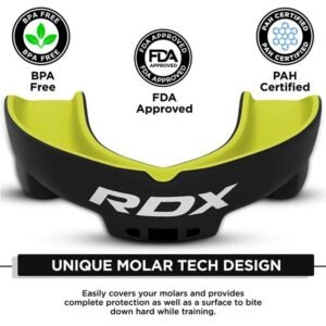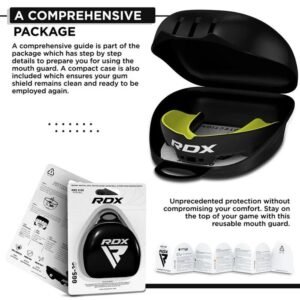 Para obtener lo último en protección bucal no busque más que el escudo de goma DRX Gel Mouthguard. Este escudo de goma se diseñó para dar un ajuste perfecto moldeando a la forma de sus dientes dejando ningún espacio para que el impacto alcance sus dientes. Utilizando la tecnología de gel SHELL-SHOCK absorbe los impactos de forma excelente y el relleno Acrigel da amortiguación de los molares también. Viene con un elegante estuche de marca RDX para un almacenamiento y transporte limpio y fácil y construido con gel eléctrico azul. Materiales libres de látex para reducir las posibilidades de irritación. Tecnología de hervir y morder para un ajuste personalizado fácil efectivo y cómodo. Construcción de Poly Gel para durabilidad y longevidad en deportes exigentes. El diseño exclusivo de SHOCK FORT brinda a los dientes protección adicional Mouthguard es perfecto para kickboxing muay thai mma e incluso rugby.